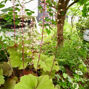 9月になりましたね。 こちらは急に爽やかな空気になってきました😌 庭のこともやる気を出して臨みたいところです😂 木陰で 花芽をいっぱい伸ばして咲いてる ヒューケラさん 少し目線を下げないと気付きません💦 うちのヒューケラ類では一番地味なお花です。 キャラメル色の葉っぱが この時期はレタスみたいな色になってるんですよね(笑)🌿 前のお宅の裏庭がすっかり見えてます🙏💦