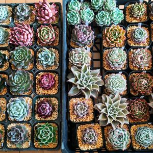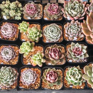 本日、入れ替えする子達でーす✨ Newフェイスも入れときました🤣 なかなか皆さんに、補充満タン状態を 見ていただくのが難しいほどの盛況でして ありがたいことなんですが少し残念w 色付きが良い子から真っ先にお迎えしていただいてるみたいですぅ✨ けど実は皆、特徴があって各々の可愛さ満載です 品種も、名前も、育てやすさもかなり厳選してます なぜなら難しい子は我が家で星にしてるから🤣 残った子達は間違いなく丈夫な品種...な...はずw