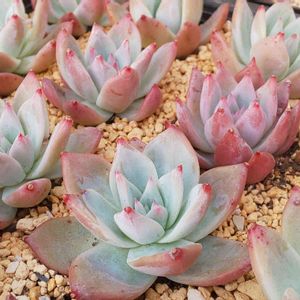 エケベリア ツインベリー×ギロ ししょーがくれた子 昨年春にど真ん中からジュレて😂 切除の結果、生還してめっちゃ殖えた✨ 4号鉢サイズが小さくなったけど 親より可愛いのは…何故⁉️🤣 大きい子はカットして 植え替えて整列してあげよう✨