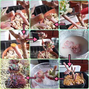 カット植え付けの手順を 聞かれましたので🤣紹介するよーw 右上スタート ・カッターを使うことが多いです ・切ったら、水分をティッシュで取り ルートンと殺菌剤を混ぜた粉を ・土台には、トップジンMペーストを ・カットした苗は、殺虫殺菌剤にドボン ・浸けてる間に植え替える ・水で綺麗に洗い流し水分を飛ばす ・もう一度、カット部に薬粉を ・ぶっ挿して完了🤣 ※ハサミだと断面が荒く表面積が 広くなる=雑菌混入の可能性が増える って、理論でハサミで切ったあとも もう一度カッターで、幹部を平らにする 色々と、はしょって書いてるから 何かあったら質問ください🤣