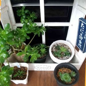 おはようございます☀ みなさまから繋がりのユーザーさんちから我が家へやってきたハオルチアとセダムばかりです。綺麗な緑💚に育ってきました。手前右のハオルチアにお初の花芽が😍 🏷るるさんのかまぼこ板で繋がる輪に参加します。 (たまさん、かおりんさん、グラン・マさん、mamanyanさん)