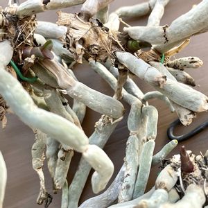 🍀胡蝶蘭🍀 さっきの胡蝶蘭の植込み材を剥がしたとこ🪴 右下の苗の根は殆どダメ😅 他のも見た目は大丈夫も使える根は少ない🤔 まずは吊るして乾燥させま〜す😘 Phalaenopsis