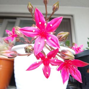 キングスターのお花が咲きだしました🌼🌟🌟 多肉の中では特別大きなお花💓 ベランダ奥の棚上に置いたので太陽求めて真横に花芽が伸びています🤣🤣