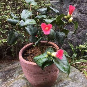 我が家の赤椿、鉢植えで小さい木ですが、毎年少しずつ花💠をつけてくれます。