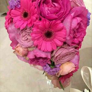 こちらはカラードレスの色に合わせた、派手目なブーケ! 派手なカラーも大好きです! 特にガーベラはこのカラーが一番すきです。 濃いピンクだいすき♪