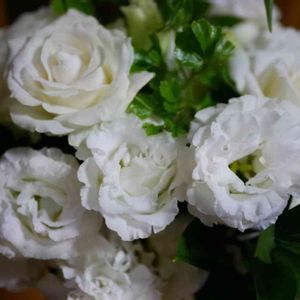 昨日、参加した結婚式でもらったお花🏵️ ホワイト&グリーン、ナチュラルでとってもかわいい💕 丁度良い花瓶がなくて、取り急ぎジャムの瓶で😅