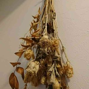 友人の結婚式のお花、ドライフラワーにしました。 最初はエアコン前に吊り下げて、涼しくなってからはベランダの日の当たらないところに。 真っ白でしたがこんな色になりました~ 麻紐で小さいの3つにしましたが、とりあえず全部一緒に玄関に下げてみました( ・∇・)