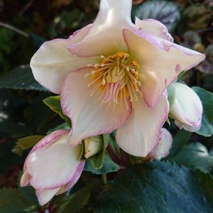 こんにちは😊 今日は暖かい春のような1日でした🌞 クリスマスローズ 氷の薔薇 ピコティ** やっと1輪開きました🙌 おととし氷の薔薇3種類花なしのポット苗でお迎えしたのですが、これが一番生長遅いよう🐢🐢🐢 まだまだ花茎が伸びませんが… 大きな花です🌸