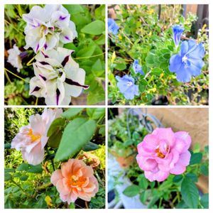 こんばんは🌛 ①🌹ジュビリーセレブレーション🩷が少し秋色で咲いています。お花は小さめです😅 ②🌹ロイヤルサンセット🧡こちらも小さめです。 ③ベゴニア マクラータ🤍お花が沢山咲いてくれています🌿 ④リーフ🌿ばかりが増えていき、お花はまだお迎え出来ずです😂