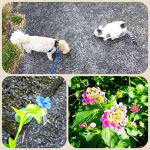 ラッキー&野良猫スーちゃん 仲良く煮干しのオヤツタイム🎶 ツユクサ ランタナ