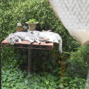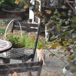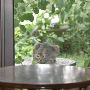 ナッツくん、ガーデニングテーブルの野良ニャンに気づかない…の図。