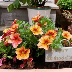 カリブラコア・ネオオレンジピコティ、 購入後にピンチしておいたのが、花盛りに❤️ カワイイです。 が!!もう一株のレイヴピンクバルバドスの方は一向に花が咲きません。 ナメクジはなんでこっちの株ばかりいじめるのか?? 置き場所のせい?? 忌避剤じゃダメかなあ?