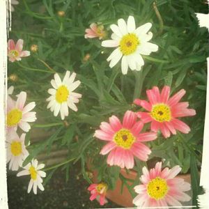 切り戻して2週間くらいのマーガレット いちごみるく 朝日を浴びて🎶 贈答用だから植え替えなくて良いのかなと思ったけど試しに鉢から抜いてみると根が張りまくり😲 植え替えたらまた元気に咲くようになりました👍 最初に見た時より赤がはっきりしてます✨ パステルカラーだったのに 不思議😃