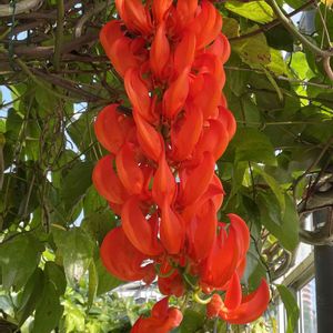 🍌熱川バナナワニ園🐊にて ❤️オウムカズラ❤️(ムクナ・ベネッティ–) マメ科 トビカズラ属 一番上の8号温室で咲いてました 2週間ぐらい咲いているようです、まだ小さな蕾もありました 11/3(水) オオオニバスの開花を待っている時 ベンチの上で見つけました 翡翠カズラ(豆科ヒスイカズラ属)に似た形のお花です。 ヒスイカズラ(青緑色)とは対照的に鮮やかな緋赤オレンジ色が綺麗です。