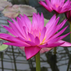 夜咲き熱帯スイレン品種🌸 💗メイプロイ💗 小型になる傾向が強い品種です 開花時間が長く昼近くまで開花を続ける事があります。 幅広の花びらには光沢感があります。