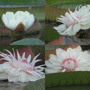 夜咲熱帯スイレン品種🌸番外編! 🌸オオオニバス🌸 南米アマゾン原産の夜咲種です! 一年草きで2日咲きです。 初日は白花で甘い芳香を漂わせながら黄金虫🪲等を花びらに閉じ込め2日目ピンク花が開く時に解き放ちます! 初日の開花時間は20時以降だと思われます!白花が咲いた次の日の朝に一度蕾に戻り(秋頃はそのまま残ってる時があります! 2日目ピンク花ですが、白から徐々にピンク色に変化しつつ夕方15時半以降から咲き始めます。 特徴として!萼には棘があります。浮き葉🌱は葉壁が低く赤茶色 葉の大きさは2メートル越えるのもあります。花と葉表意外棘を纏った鎧です!外敵(魚等)から身を守る為だと思われます! 他の種と比べると(パラグアイオニバス)耐寒性が弱いです! 備考〜植物園で子供が葉の上で乗るイベントするのは主にパラグアイオニバス、ロングウッドオニバスです。
