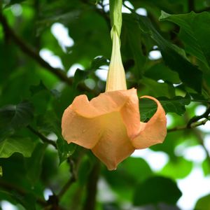 「ブルグマンシア・ウェルシコロル」 ※エンジェルストランペット ※咲き始めは白色で咲き進むと橙色に変色します 高木なので 咲き始めの白花は上手く撮れない💦 京都植物園温室2025/12/7