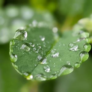 今朝は全てずぶ濡れ… 木通の葉も雨粒で飾られて