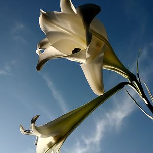 庭の地植えのシンテッポウユリ😱 🌼 ? 🙌 🔫😳 😓水鉄砲 開花し始めました😳 草丈が2m近いので 夕空を背景に撮ってみました こぼれ種で庭の至る所に生えてくるので🌱 見つける度に球根を掘り出して 一ヶ所に植えかえています😱