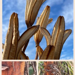 朝🐕散歩 タカサゴユリ の花後 背の高い茎もしっかりした高砂百合 下の方にはヒゲが沢山出ていました〜