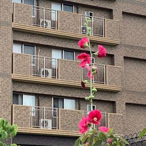 2023年6月27日 火曜日 12:50 赤い立葵(近所の家庭菜園にてNo.1) マンションと高さを競い合うかのよう。