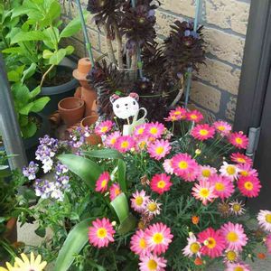 いつも山野草🌿ばかりpic📸しているけど、今日は家🏠の玄関でお出迎えをしているマーガレットと黒法師と忘れていましたミーちゃんです