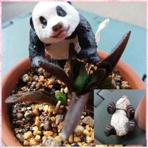 パンダの日🐼 メルカリのおまけでいただいたハオルチア。名前はわからないし、来たときからカリカリで何ヵ月も…たまにお水あげて、もうお星さま⭐になってるのかと思うほどだったけれど、動き始めたようです😲 そしてガチャのパンダさん。足の裏までしっかり😆