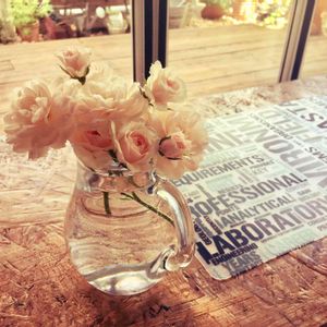 デッキリフォームの廃材で作ったOSBのテーブルに 庭から摘んできた薔薇を✨