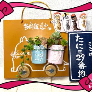 ニャンニャン祭り🏷 参加させて頂きます。 るるさんから頂いた、 ニャントラ便プレートにちまちま寄せ植え しました。 くま子さんから頂いた、にゃんこシール るるさんのたに区プレート を添えて💕💕💕