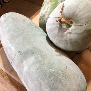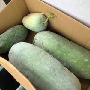 冬瓜。 どう食べるか皆さんから教わりたい。 大小の冬瓜、ちいさいひとつは、生でサラダの様に食べて見ます。 大きいのは、35センチ、子供を抱くより重いです。 ちょっと困る程の大きさ。