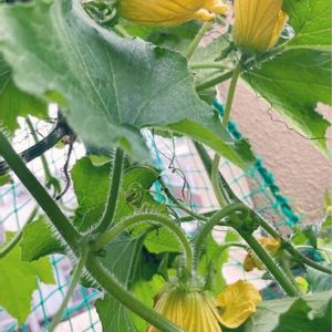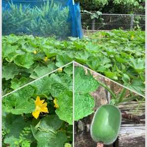 週末の夫の楽しみの家庭菜園 夏野菜の『冬瓜』が実を つけ始めています💚💛💚💛 花は少し大きめの黄色です。 実は『うり小僧』と言う銘柄の 小ぶりの冬瓜で一般家庭では 一回で残さず使えるので 便利なんですよ💚💛💚💛