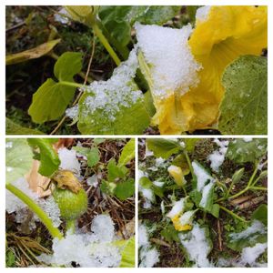 冬瓜: 畑で勝手に生えてきた冬瓜雪があっても花咲いてる。 こんなに寒いのに実もついてます。 なんて強いんだろう。 今日はもう雪も降っていないけれどとても寒いです。