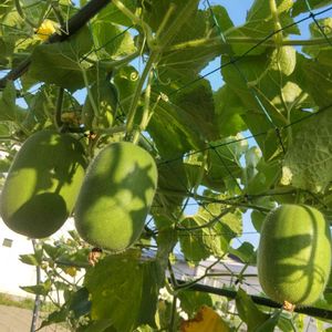 週末、夏野菜の 収穫してきました。 シカクマメ ゴーヤー ヘチマ ミョウガ モーウイ 冬瓜 ピーマン🫑 茄子🍆 パッションフルーツ パッションフルーツはカラス対策 のネット掛けが功を奏し被害に 合わずにすんでます。 ネットの中に落下したのを 収穫してます。 因みにネット掛けは一本の木に 約70枚程使いました。
