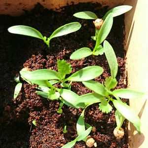 種まき後14日目のパクチーたち よく見たらすでにパクチーの葉っぱの形したやつが出てる。 種を分割して水につけてから蒔いたら発芽率高くてびっくり。密集している。さてこの後どーしたらいいのか。
