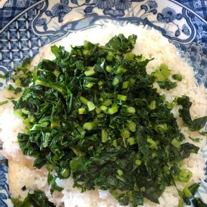菜飯 庭で採れた大根葉。 塩を振り、ポリ袋に入れタオルに包んで、足で踏み、組織を壊して絞る。 味見をして塩辛い様なら洗って絞る。 みじん切りにして、炊き立てご飯に混ぜる。