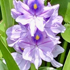 散歩コースにある小さな池… 睡蓮の隣りで涼しげに咲いていたホテイアオイ💜 別名・ホテイソウ、ウォターヒヤシンス