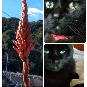 おはようございます🤩 今年初のみちのすけさん主催の にゃんにゃん祭りに参加です😻 左手に見えますのは グングン伸びているアロエです🌺 徐々に開き初めています😍 満開の時にはコロナもオミクロンも 退散してますよね😃✌️ 右上黒猫ダイズ君🖤😻 私の仕事中はじっと 遊びたいのを我慢しています。 「早くパソコン終わんないかなぁ」 右下「僕にダブルクリックは 無理だって〰️🙀」 良いの良いの🎶 君が居てくれるだけで お仕事もはかどるよ😃 深夜の地震アラート音には ビックリ😵🥶 起きてはいましたが 長崎は揺れを感じません でした🤗 被害に合われた方々に お見舞い申し上げます。 まだ余震があるようなので 充分に気をつけましょうね🙂 🏷️今日も元気に♪🌈 そこそこ頑張りマッショイ(*^^*)