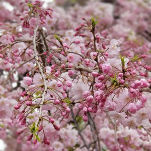 松月 (ショウゲツ) 遅咲き桜(関東地方で4月中旬~下旬) 華やかな八重咲き。 花びらは中心から真っ白で 周辺がほのかにピンク色。 花弁のふちにナデシコのような細かい切れ目 フリンジ。 花はいくつか毬のようにまとまって下向きに咲く。 そして特徴的な 葉化した雌しべが 花の中心から緑の角を出します。これがある桜は数種類しかないようです。