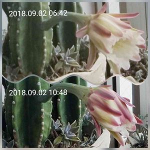 🌵柱サボテン鬼面角のお花①🌼 🌃咲いて、🌅しぼむ、一夜限りのお花だそうです。 左と右上が本日のAM4時に撮影したばかりのお花で、右下が昨日のPM17時に撮影したツボミです💛💚 今年ツボミ3つ目で、ようやくお花が見れました。起きてて良かった⤴️大🈵足‼️😃✨
