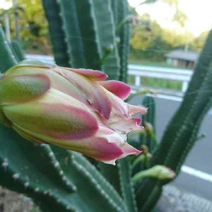 以前に見つけた鬼面角のつぼみ。 残念ながら花は見られなかったけど😢 右上は1ヶ月後。 実❗️ 約2ヶ月後にはどエライことになってた🐉 ドラゴンフルーツみたい😊 ◌⑅◌┈┈┈┈┈┈┈┈┈┈┈┈┈┈┈┈┈◌ 先日、また行く機会があったので 実を下さい と言ったら赤いのはもう落ちてありませんでした😥 そんなに気に入ってくれたなら差し上げますよ😊 (´・ω`・)エッ?何を? と思っていたら、サボテン自体をくれようとしたので… いゃぁ…さすがにデカいです😅 あ、この先の小さいのを… ヾ(°∇°o)ノアハハありがとうございます… 先の5cmほどの丸っこいのを下さいました😆 実が生るまで何年かかるのだろうか🙄 しかし良い方です😊