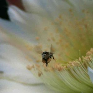 足に花粉いっぱいつけたミツバチ まだまだ足りないのか、サボテン🌵の花の中に おしり振りながらカワイィ~💕