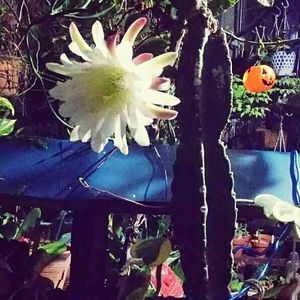 鬼面角のお花が咲きました✨ 夜のお庭で幻想的に輝いています✨ うさちゃんがビンゴで当てた思い出のサボテンなのでお花が見られて嬉しいです❤️ ピンボケですが💦
