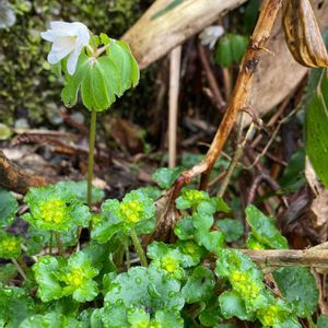 2020.3月 安芸太田 アズマイチゲのリベンジに来ましたが、生憎の日差し…。今日もリベンジならず、開いてくれませんでした😔 自生地は二ヶ所とも、足元はヤマネコノメソウでした。仲良しなのね。 ネコノメは葉が互生してるのをちゃんと確認してきました。なのでやっぱりヤマネコノメソウ。でもやっぱり雄蕊は4つのみでした。という事は⁈
