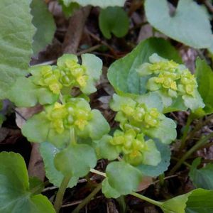 ユリワサビの近くにはヤマネコノメソウ 前日の雨でたぶん種が流れ落ちたのではと思われます ネコノメソウとの違いは葉が互生で茎の間の葉数が少ない事
