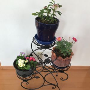 ウッドデッキガーデニングスタート💕 やっと出来上がりました。濡れてもよいようにウッド風にしました。 あまり雰囲気は変えてません。階段も二ヶ所設置したのですが右側にノウゼンカズラを植えたのでその根っこが床下に伸びて…。右側の階段は20㎝程カットしてもらいました😊 とりあえず移動して並べてみました。今日は寒くてなかなか出来ません♥️ 徐々にかな?