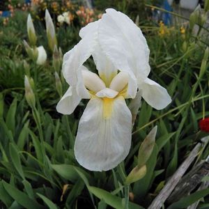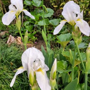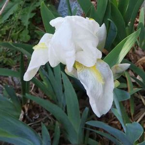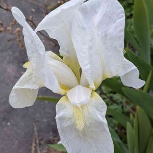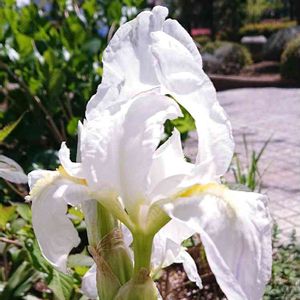 🌸ジャーマンアイリス🌸 (手前には次の蕾があります) 広い葉と花弁の黄色いヒゲ! 白のジャーマンアイリスではないですか? 豪華な色のが多い中、 白いのはシンプルですよねー! ニオイイリスと言う名前があるようです。