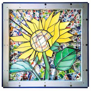 20241104 番外編 ヒマワリ(1000✕1000✕20ミリ) 折れて壊れれてしまった傘の骨で輪郭を作り、周りは牛乳パックで飾ったステンドグラス風の作品(内部からバックライトを点灯)