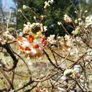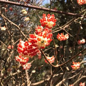 花の感じは、ジンチョウゲに似ていますが、こんな色は、違う💦 そして葉っぱは、一枚もありません😰 香りは、ジンチョウゲ似て良い香りがしました、 どなたか名前を教えてください🙏 教えて頂き、ベニバナミツマタ または、アカバナミツマタと言うことが分かりました。 ジンチョウゲの仲間だったので、香りも似ていたみたいです。