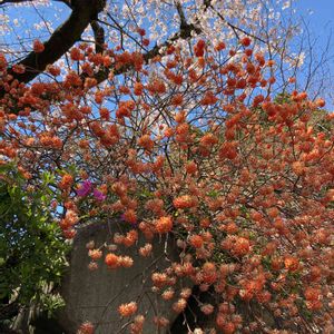 このオレンジのまりのようなお花が枝いっぱいに咲くこの植物は何でしょうか❓ 結構、大きな木です 初めて見ました✨ とどまつさんから教えていただきました😊 ベニバナミツマタという名前です