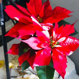 🏷真っ赤な火曜日 参加します ポインセチア トウダイグサ科属 和名「猩々木(ショウジョウボク)」 別名「クリスマスフラワー」 花言葉「祝福する」「聖夜」幸福を祈る 今年の春にご近所さんから「何年か前に娘からプレゼント🎁されたポインセチアですが 枯れそうになったので面倒見て欲しい」と依頼されたので、剪定や植え替え・肥料などを施したら元気に育ちました👌 持ち主に見てもらったら「とても元気になったね」と喜んでいて、返すつもりでしたが そのまま面倒見て欲しいとの事で我が家で育てる事になりました👌👍🏻🥰 和室にて 25.12.09